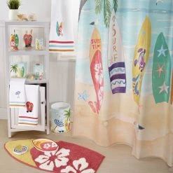 The Avanti Surf Time Decorative Hand Towel features a pair of embroidered orange and coral flip-flops and blue sunglasses. The 16″ x 28″ white terry towel is made of 100% cotton (excl. of embellishment). The sky blue, coral and mustard borders add the perfect finish to the towel.