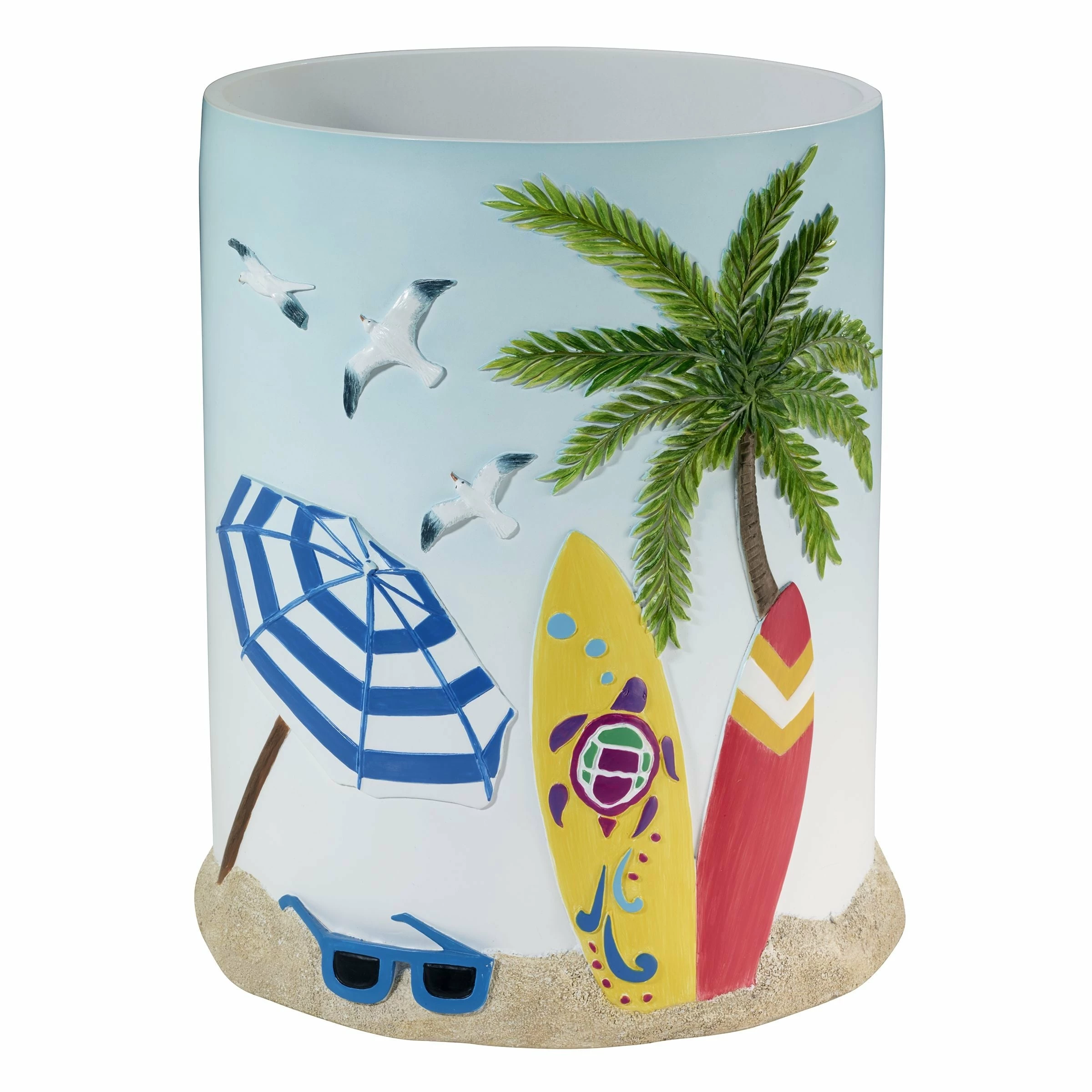 The Avanti Surf Time Wastebasket features an ombred white-to-sky blue ground with dimensional yellow and coral surfboards, seagulls, a blue and white beach umbrella, blue sunglasses and a palm tree. The base is crafted to look like sand. Made of durable, hand-painted resin.