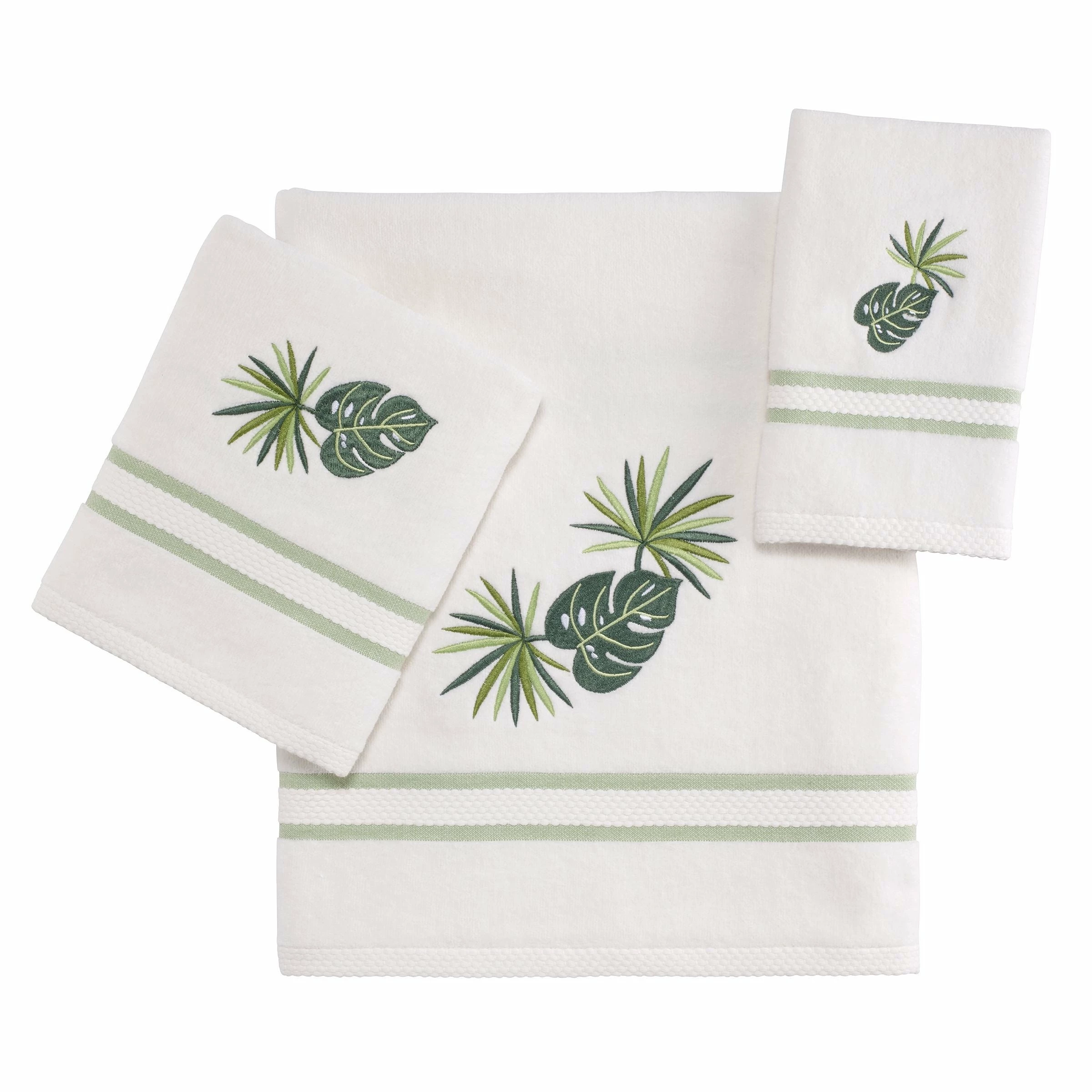 The Avanti Viva Palm Decorative Bath Towel features a beautifully embroidered petticoat palm and split leaf philodendron design in various shades of green on a white terry ground. Towel is 100% cotton, exclusive of embellishment, with coordinating green stripes to finish the look. 27″ x 52″.