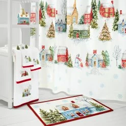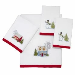 The Avanti Warm Welcome Decorative Bath Towel features an embroidered light blue house decorated for the holidays with colorful accents and framed by trees on either side. The 100% cotton white velour towel is finished with a woven red polyester border. 27″ x 50″, machine washable.