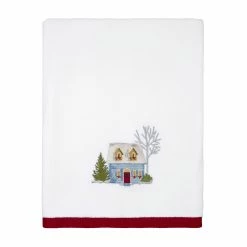 The Avanti Warm Welcome Decorative Bath Towel features an embroidered light blue house decorated for the holidays with colorful accents and framed by trees on either side. The 100% cotton white velour towel is finished with a woven red polyester border. 27″ x 50″, machine washable.